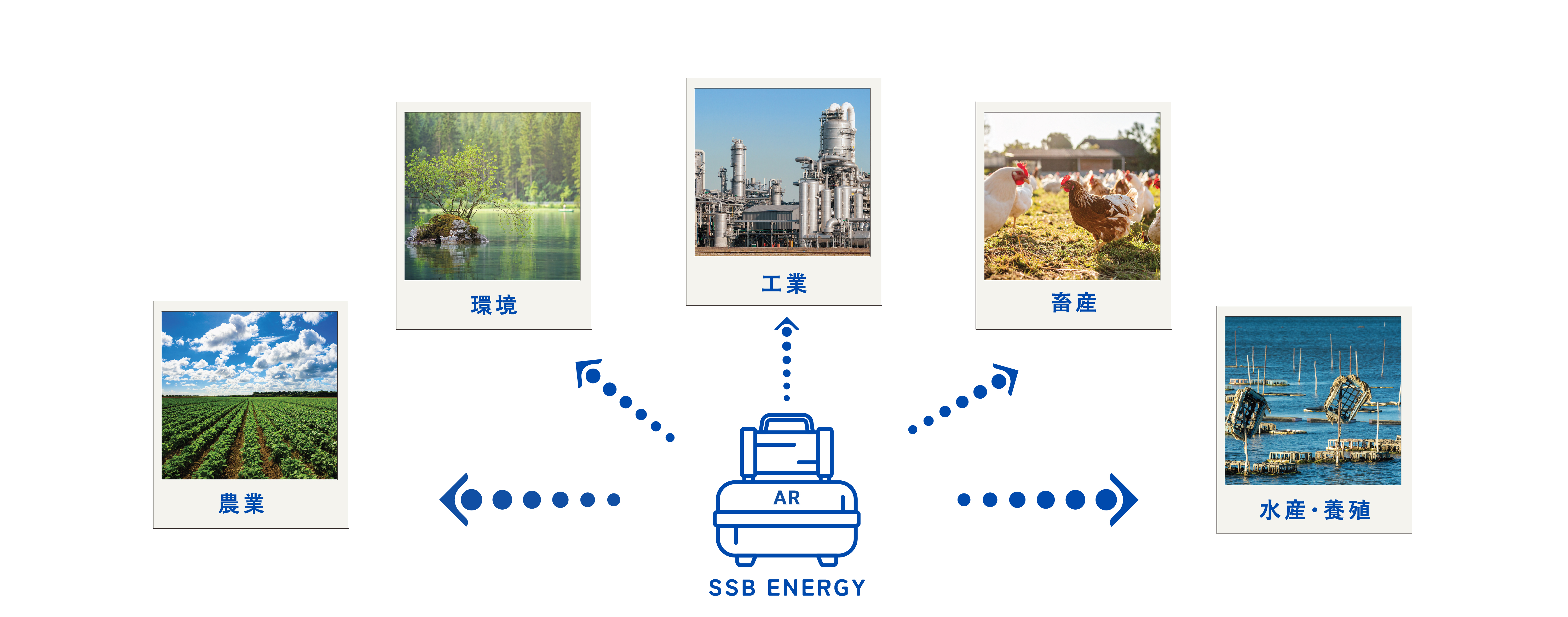 TSUBASAグループでは“世界に自然を移植する”ことを目指し、エアーリフォーマーの活用によって、工業、農業、水産・養殖、畜産、環境保全などの幅広い分野において、皆様の抱える多様な問題点の解消や 改善に取り組んでいます。このエアーリフォーマーから生み出されるSSB改質空気は次のような 分野で作用します。