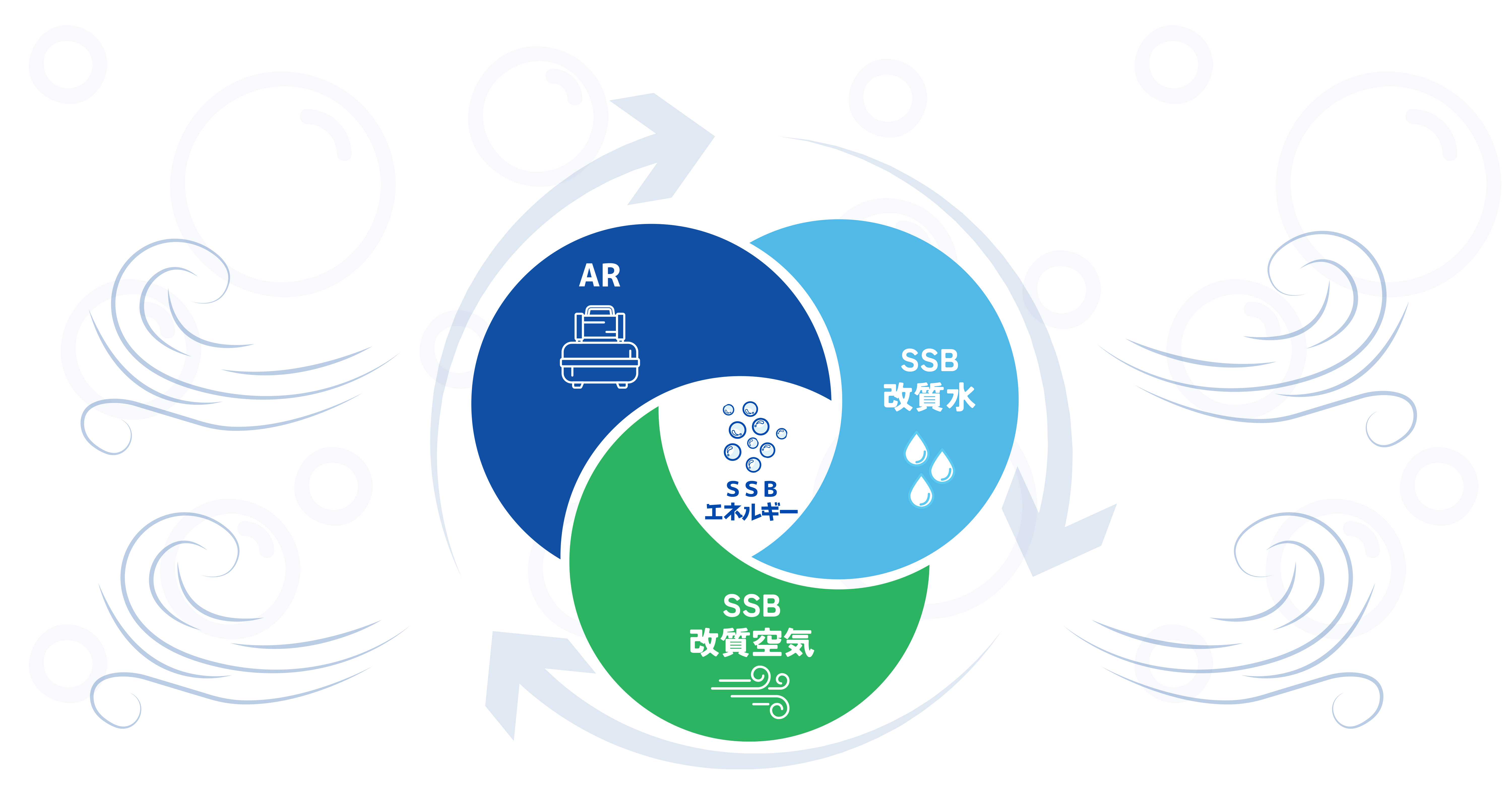 SSB改質空気の利用には、用途によって、①エアーリフォーマー(AR)から生み出された改質空気を そのまま利用する方法のほか、さらに、②改質空気を微細な泡にして水に曝気させることにより、この 空気に含まれたSSBエネルギーを水に移動させ、SSBエネルギーを持つ水(SSB改質水)に変えて 利用するという方法があります。